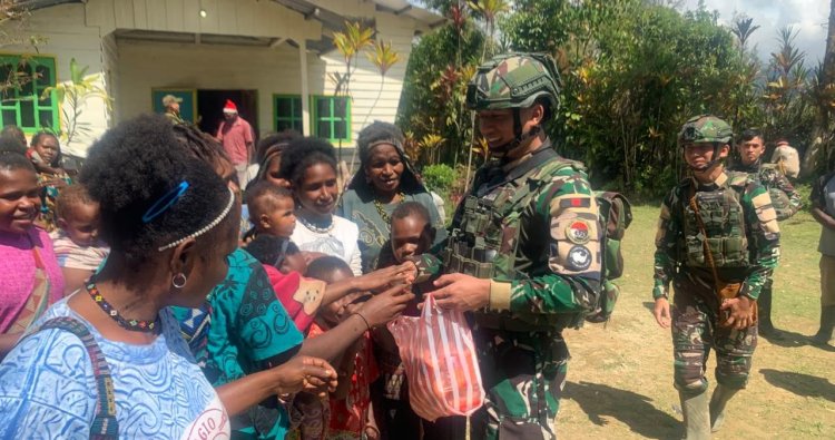 Warga pun tampak tersenyum bahagia setelah menerima bingkisan makanan ringan dari para prajurit. Bagi mereka, perhatian sederhana ini memiliki makna besar menjadi pengingat bahwa di tengah keterbatasan, kasih dan kepedulian tetap tumbuh di tanah Papua.